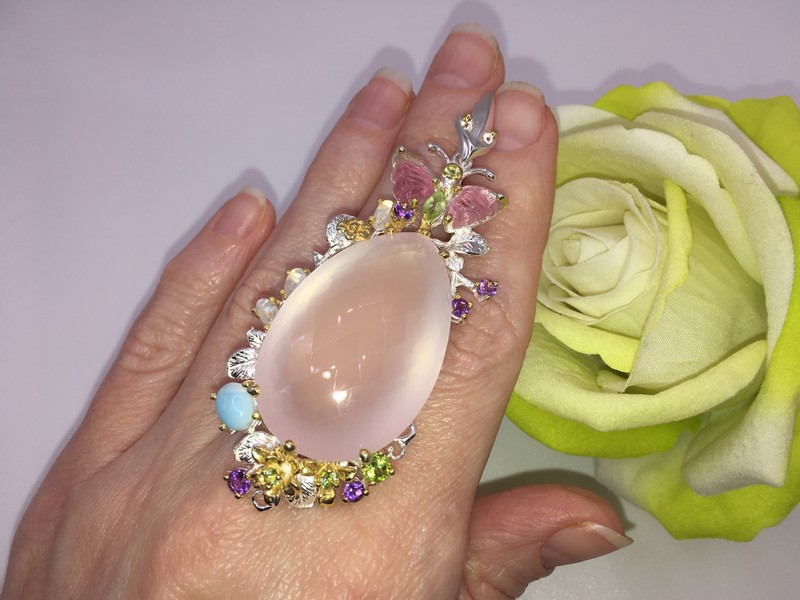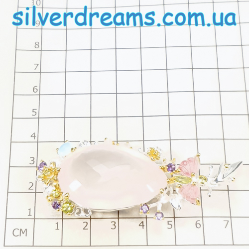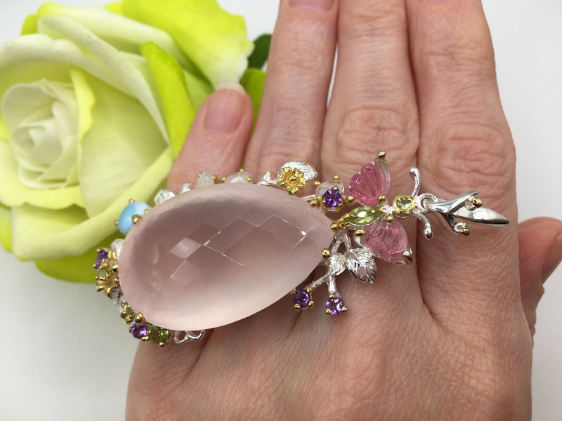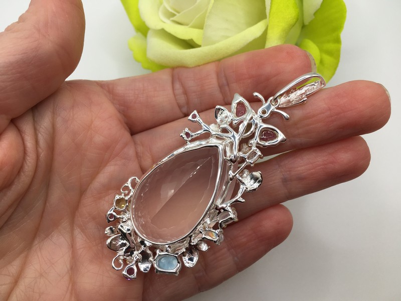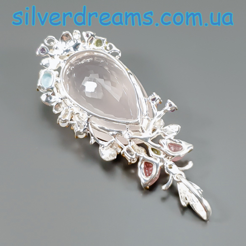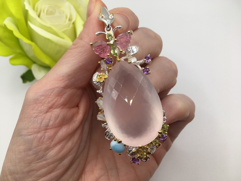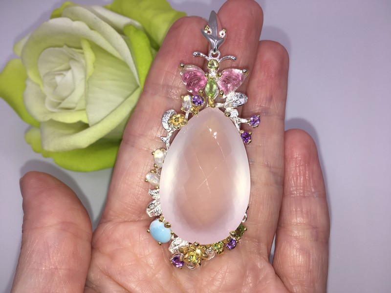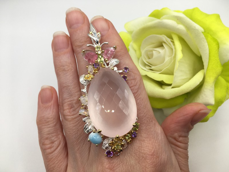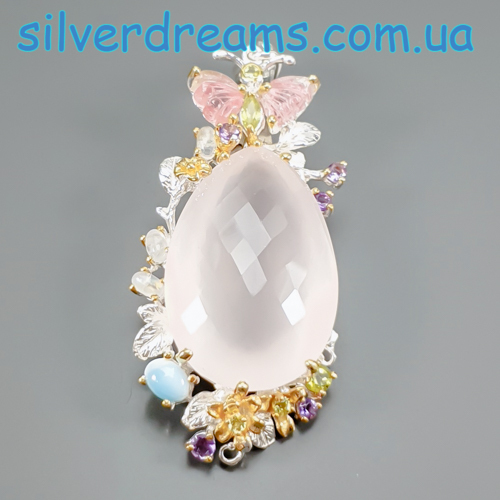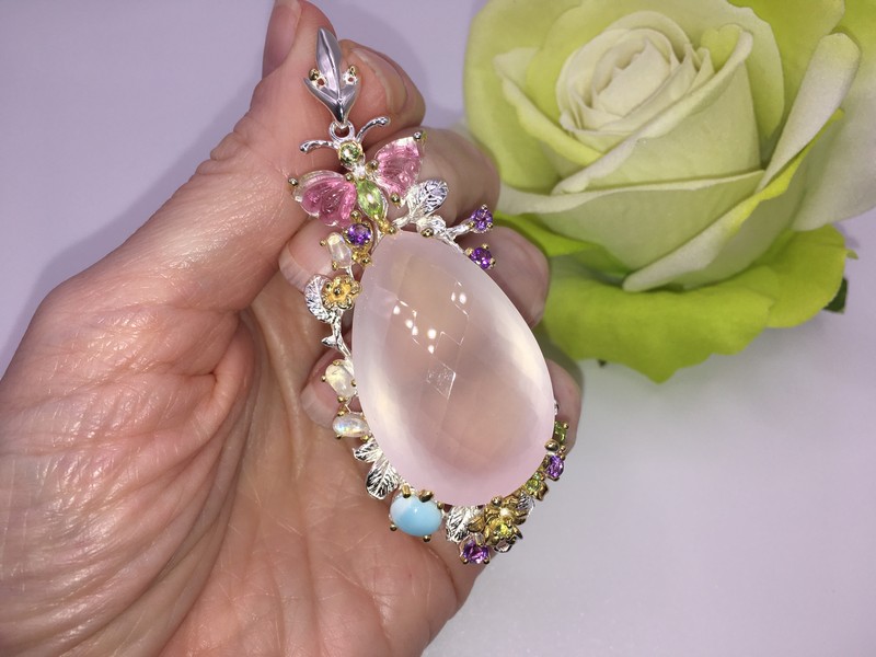 Уникальный кулон ручной работы из серебра 925 пробы в двухцветной позолоте (белое + лимонное золото), инкрустирован крупным натуральным розовым кварцем, природными турмалинами, ларимаром и хризолитами.