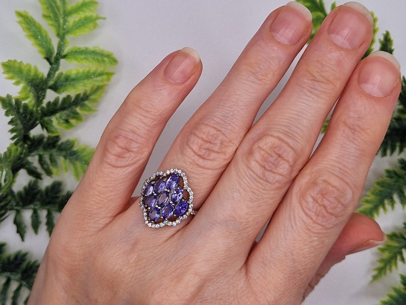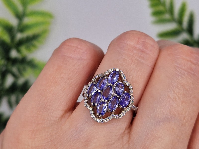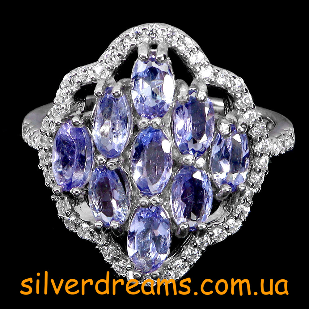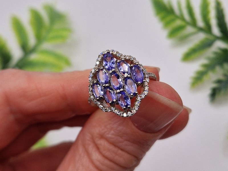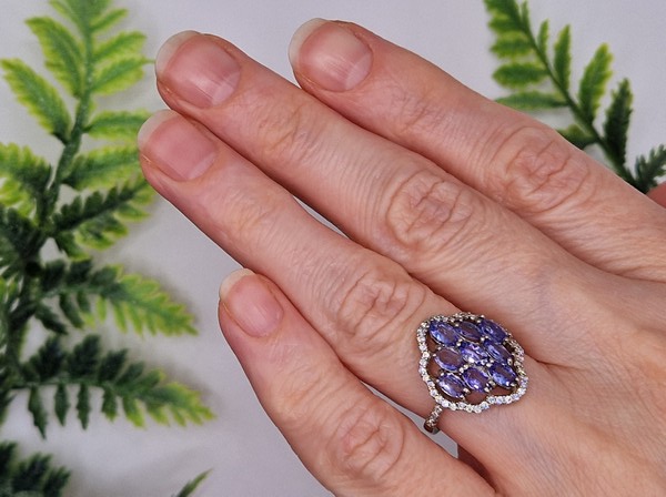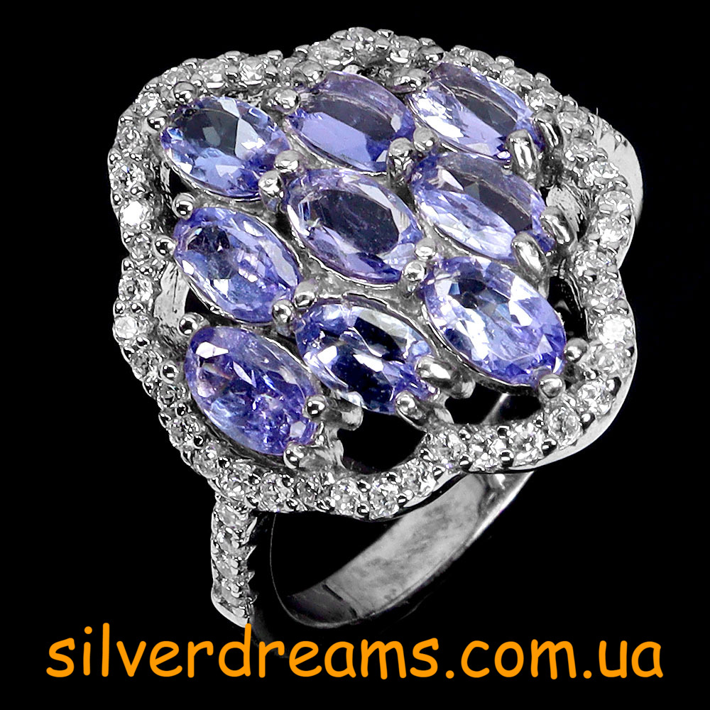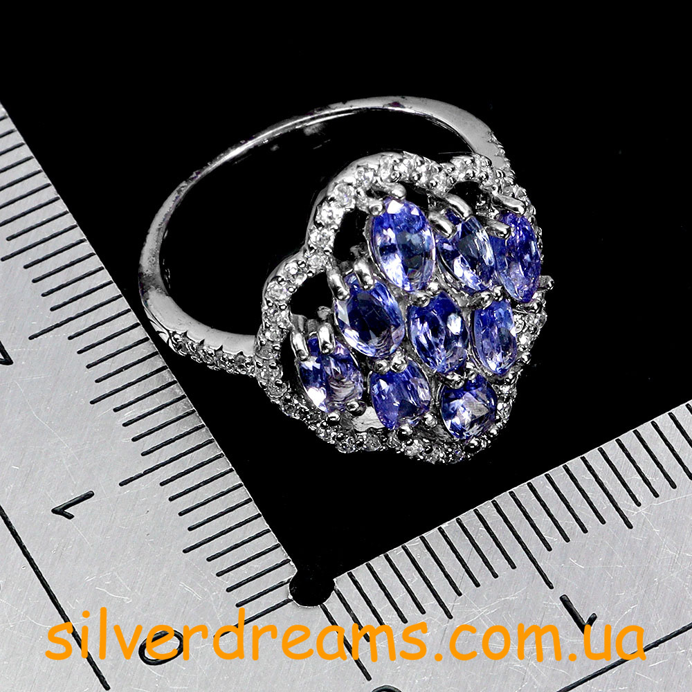 Размеры: танзаниты — 5х3 мм, фианиты — 1 мм; корона кольца — 20х18 мм.