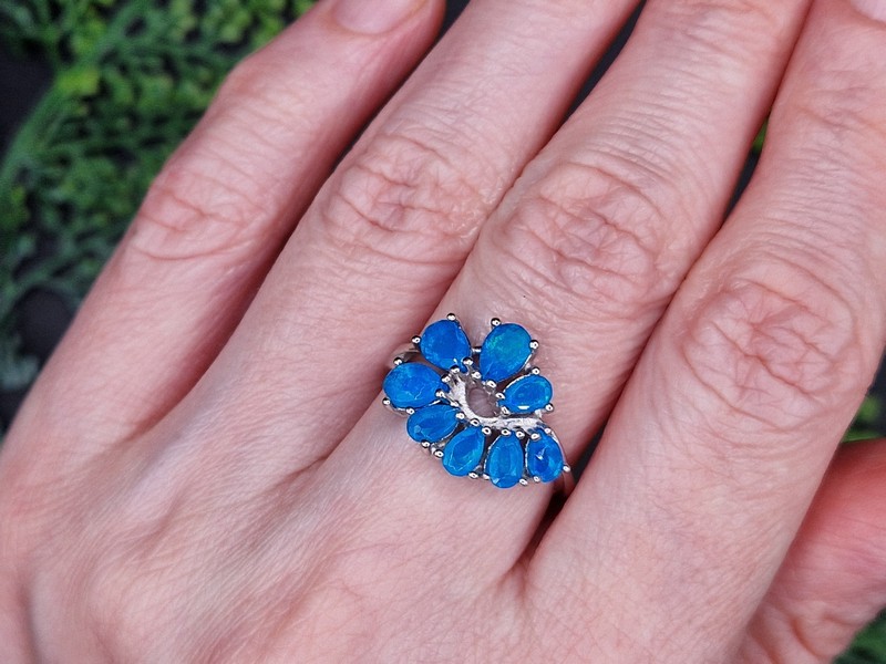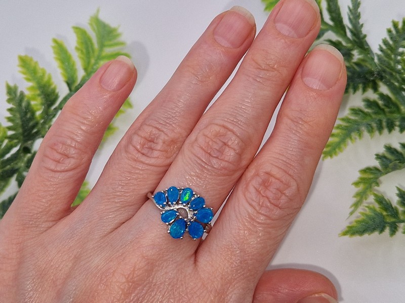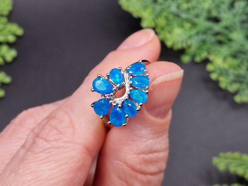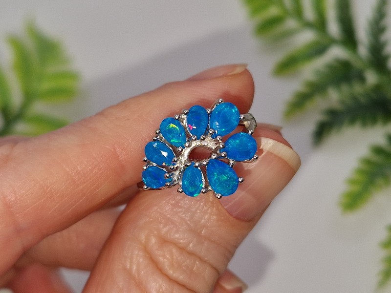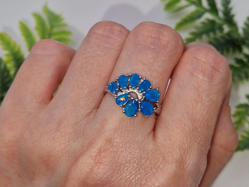 Изумительное мерцающее кольцо из серебра 925 пробы, покрытого белым золотом, с натуральными голубыми опалами.