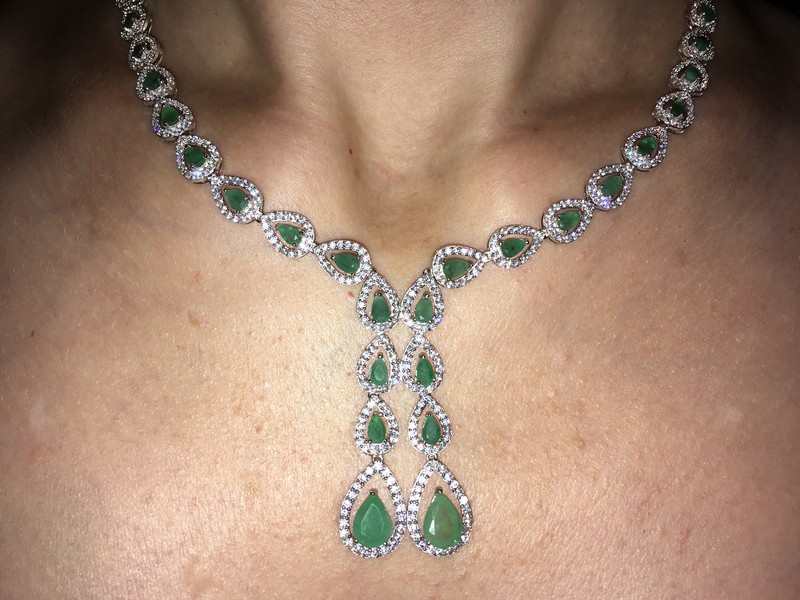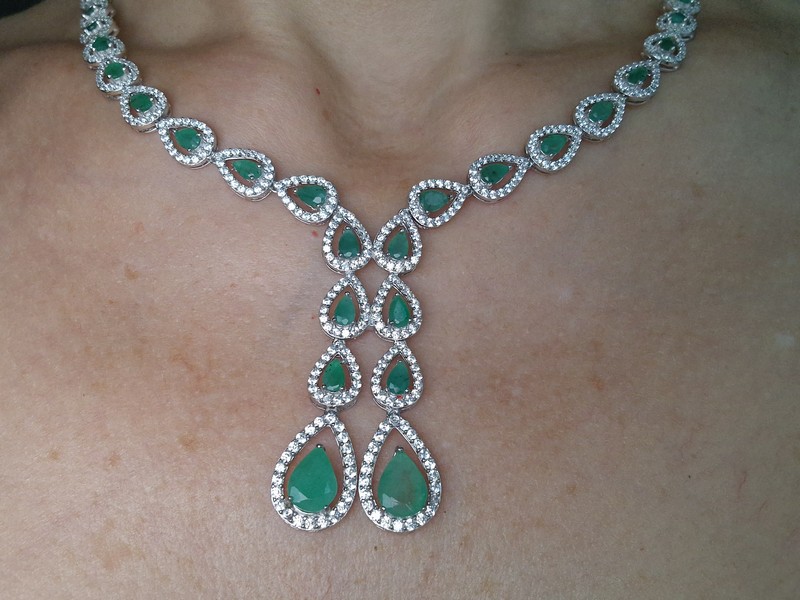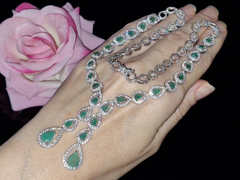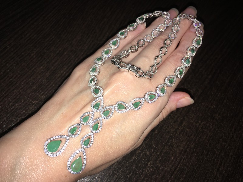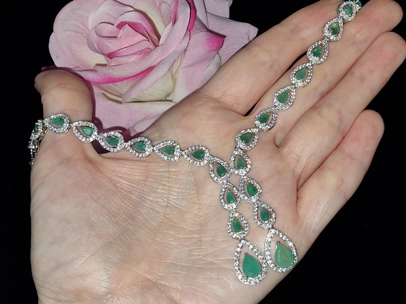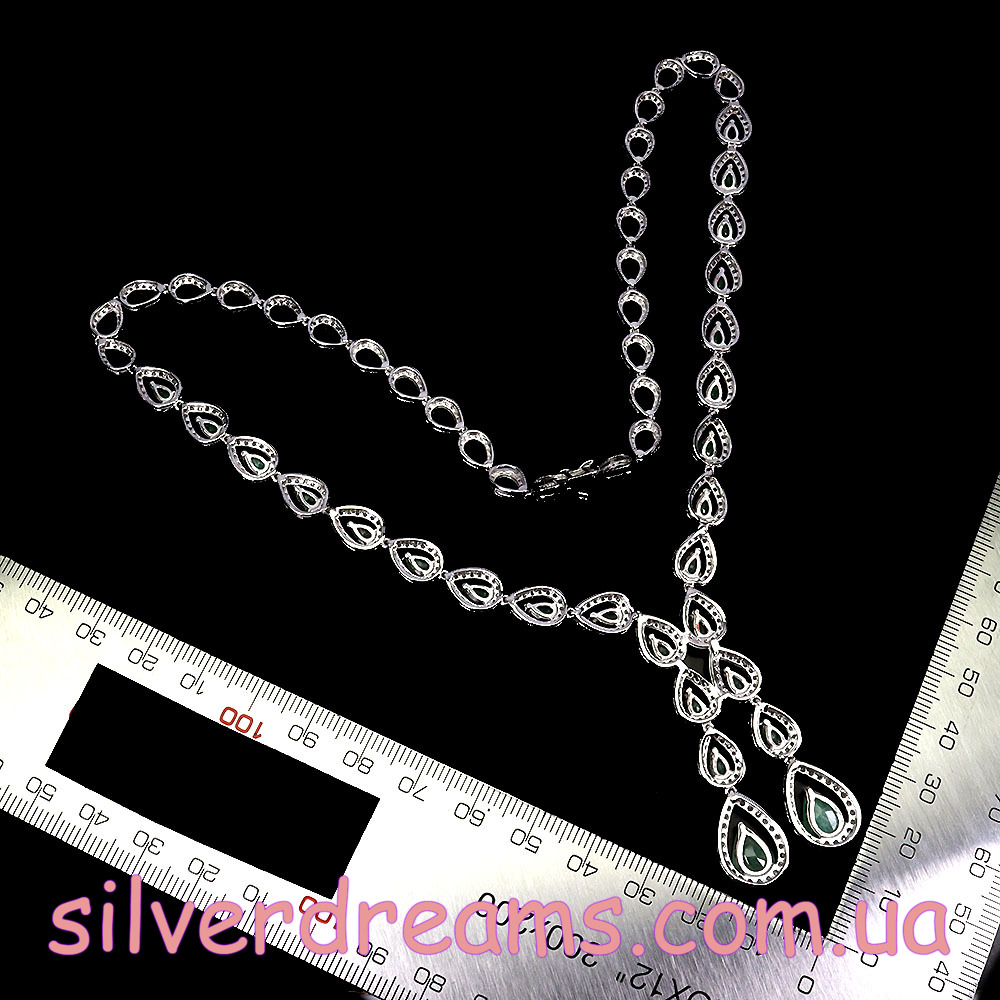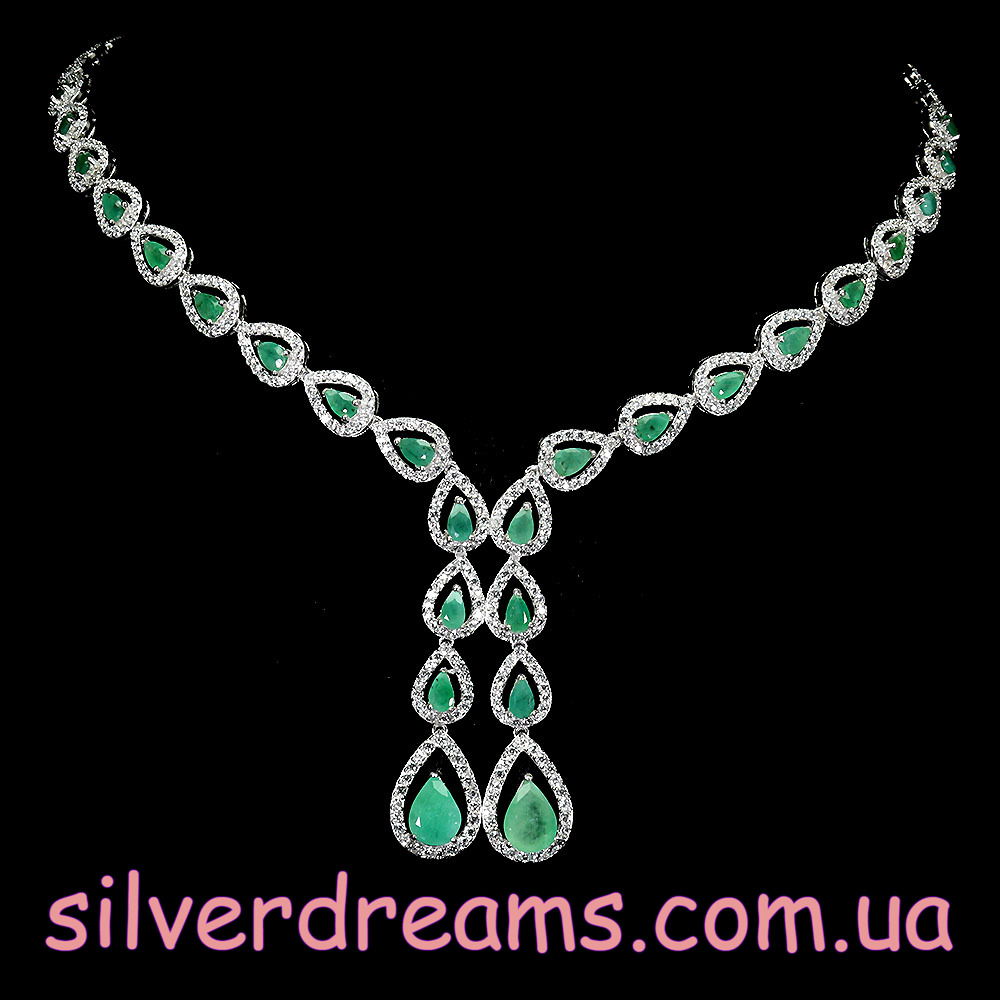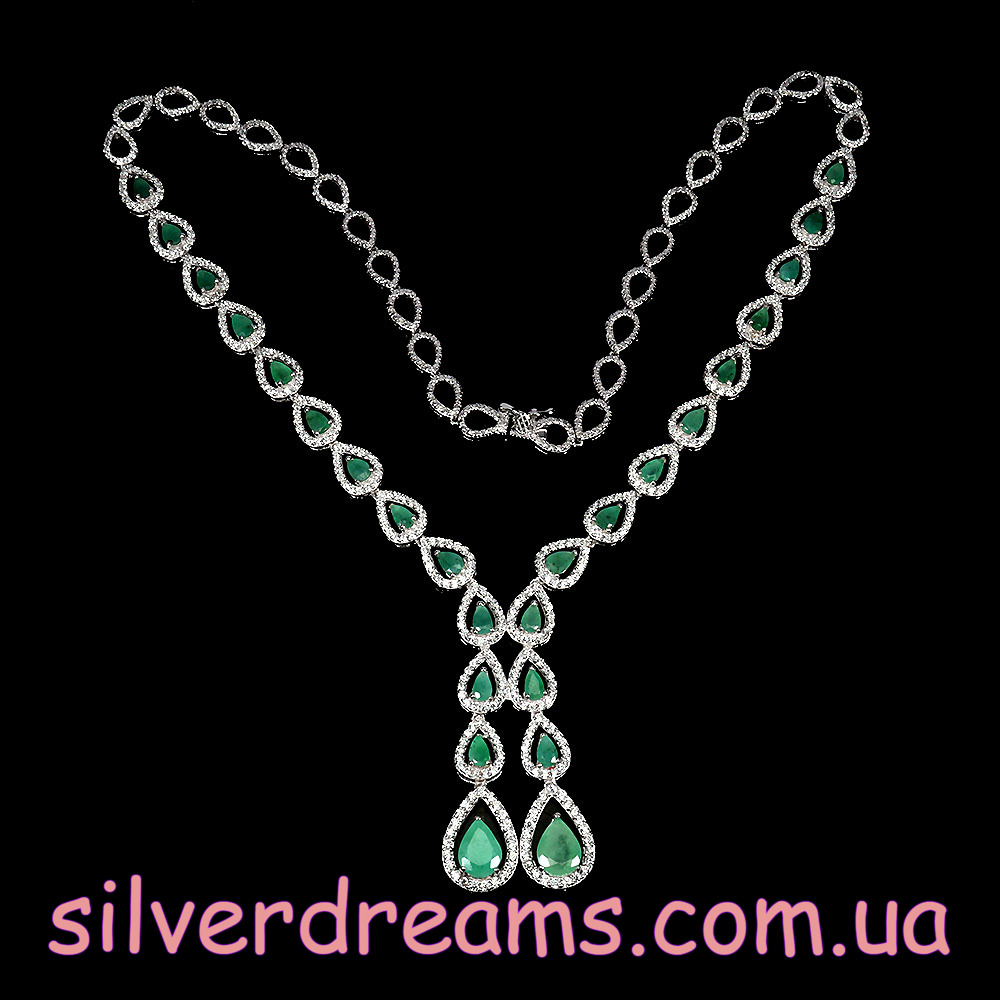 Несравненное обаятельное ожерелье из серебра 925 пробы, покрытого белым золотом, инкрустированное натуральными изумрудами и россыпью фианитов.