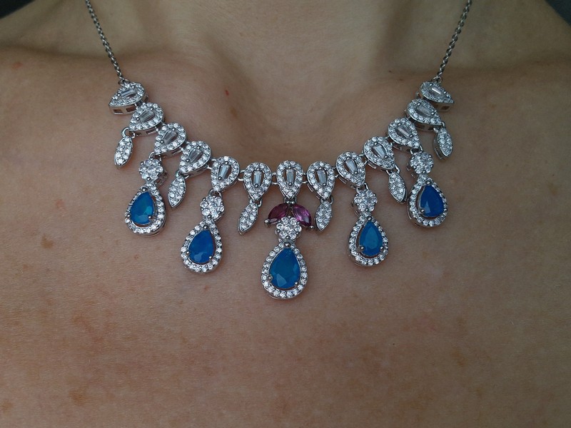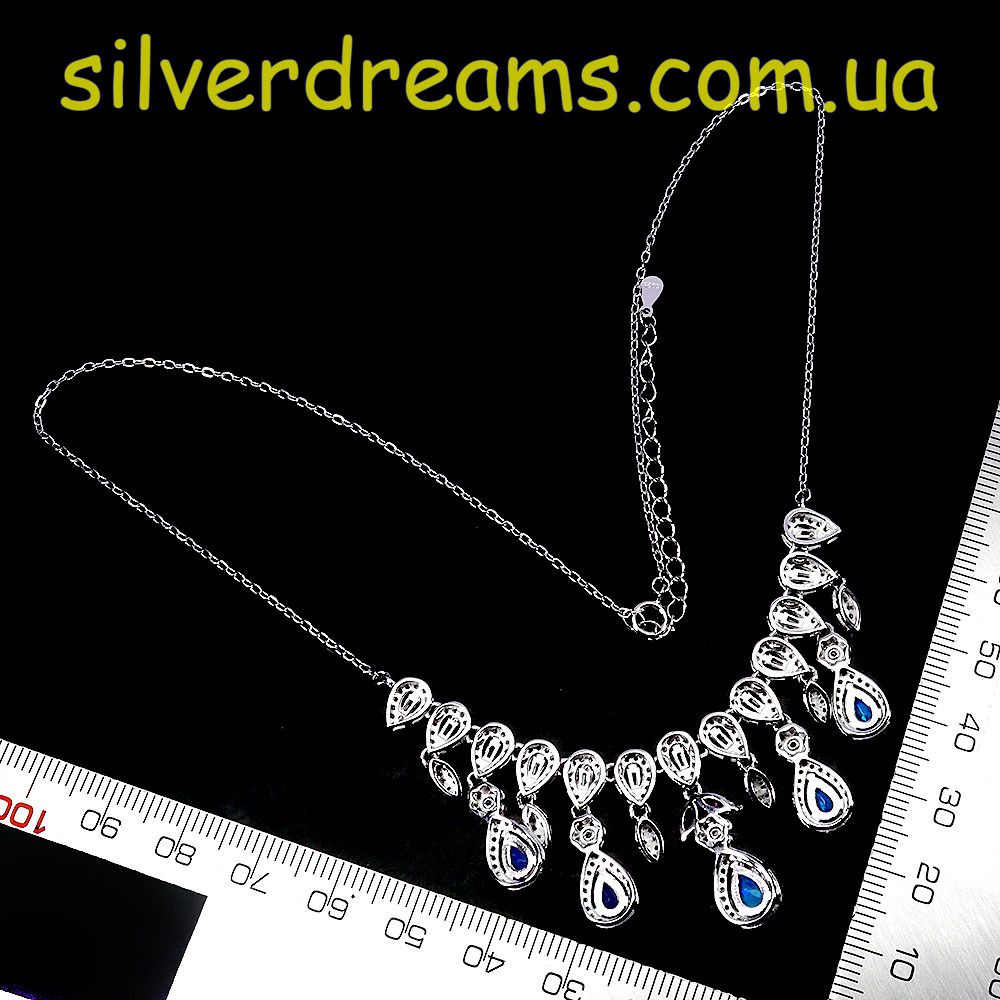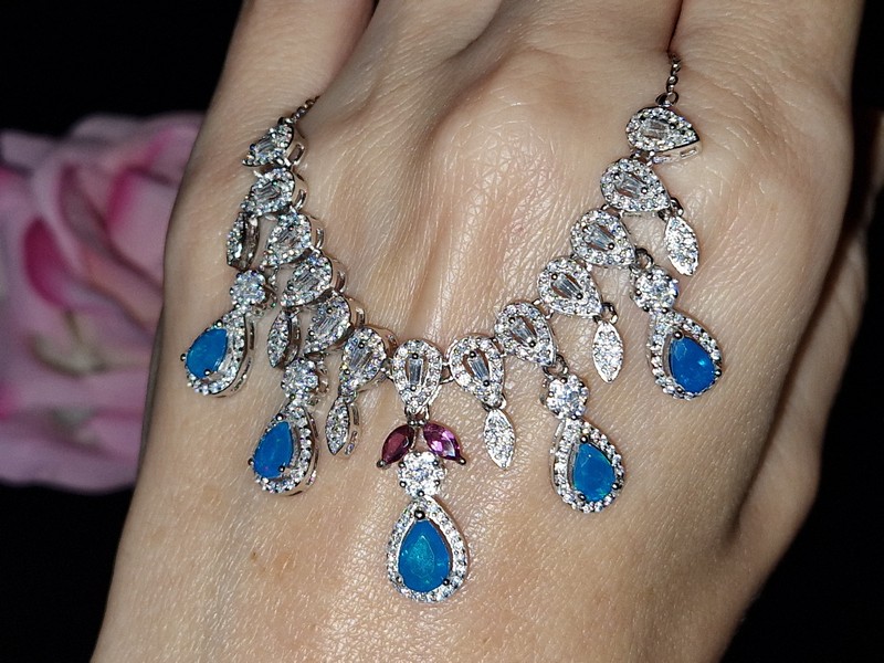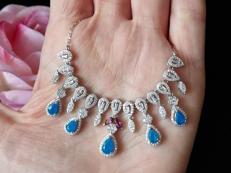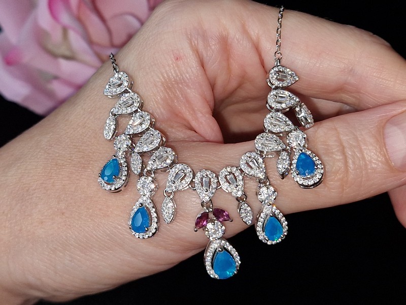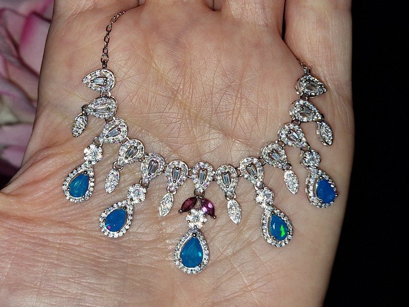 Яркое впечатляющее колье из серебра 925 пробы, покрытого белым золотом, с натуральными голубыми опалами, природными родолитами и россыпью фианитов.