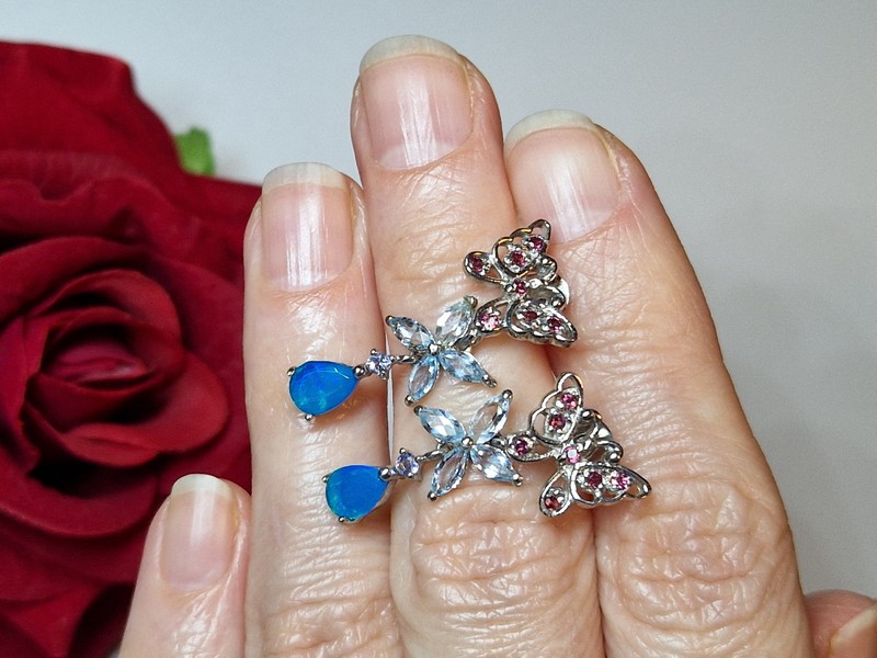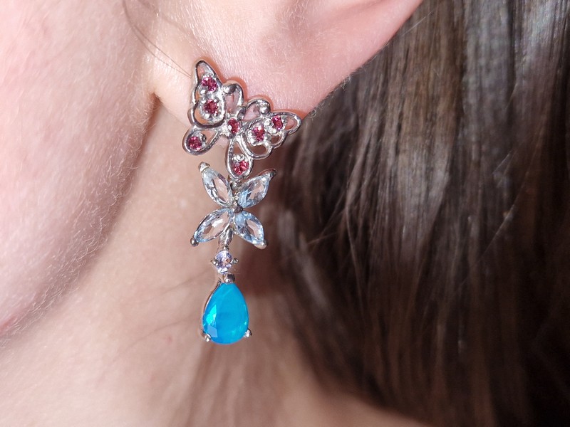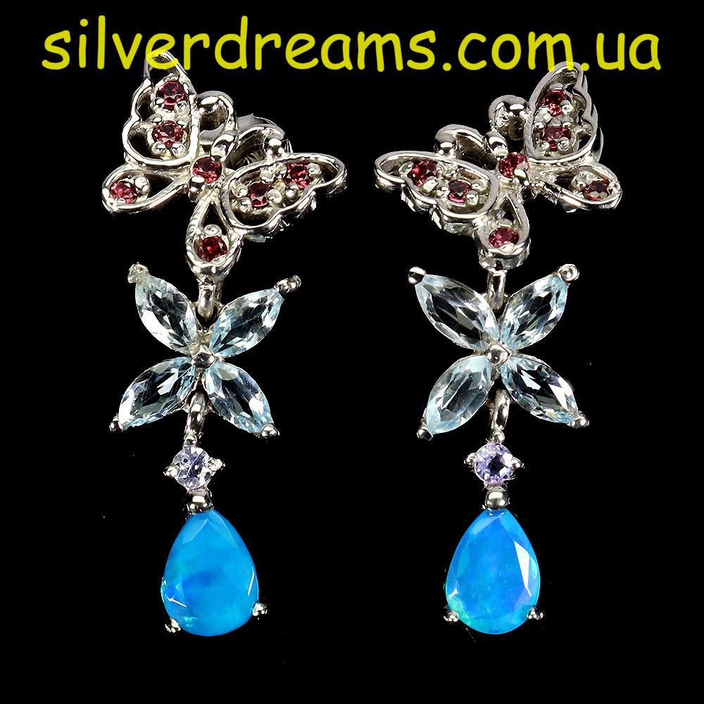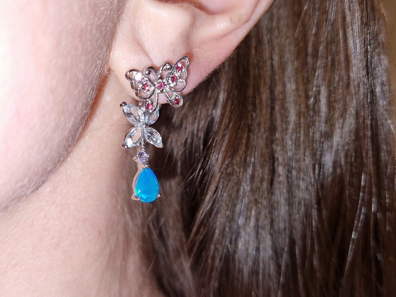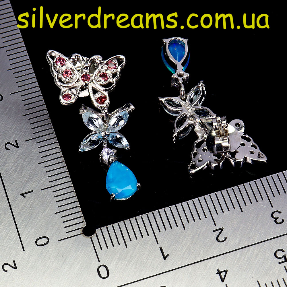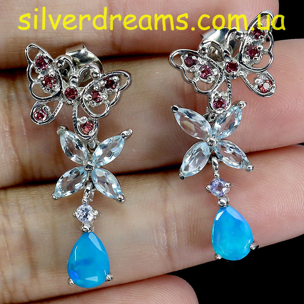 Миловидные притягательные серьги из серебра 925 пробы, покрытого белым золотом, инкрустированные натуральным голубым опалом, природными аквамаринами и родолитами, застежка – гвоздик.