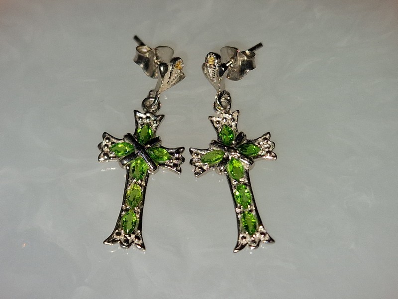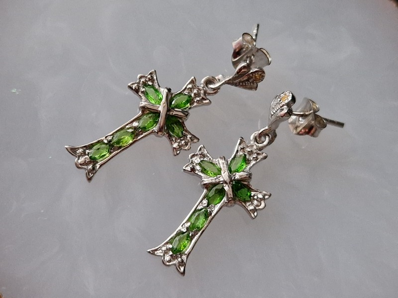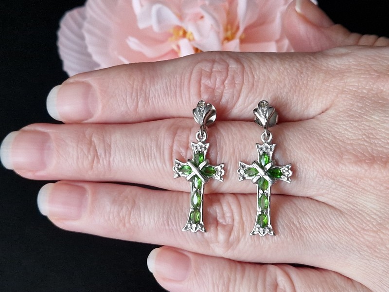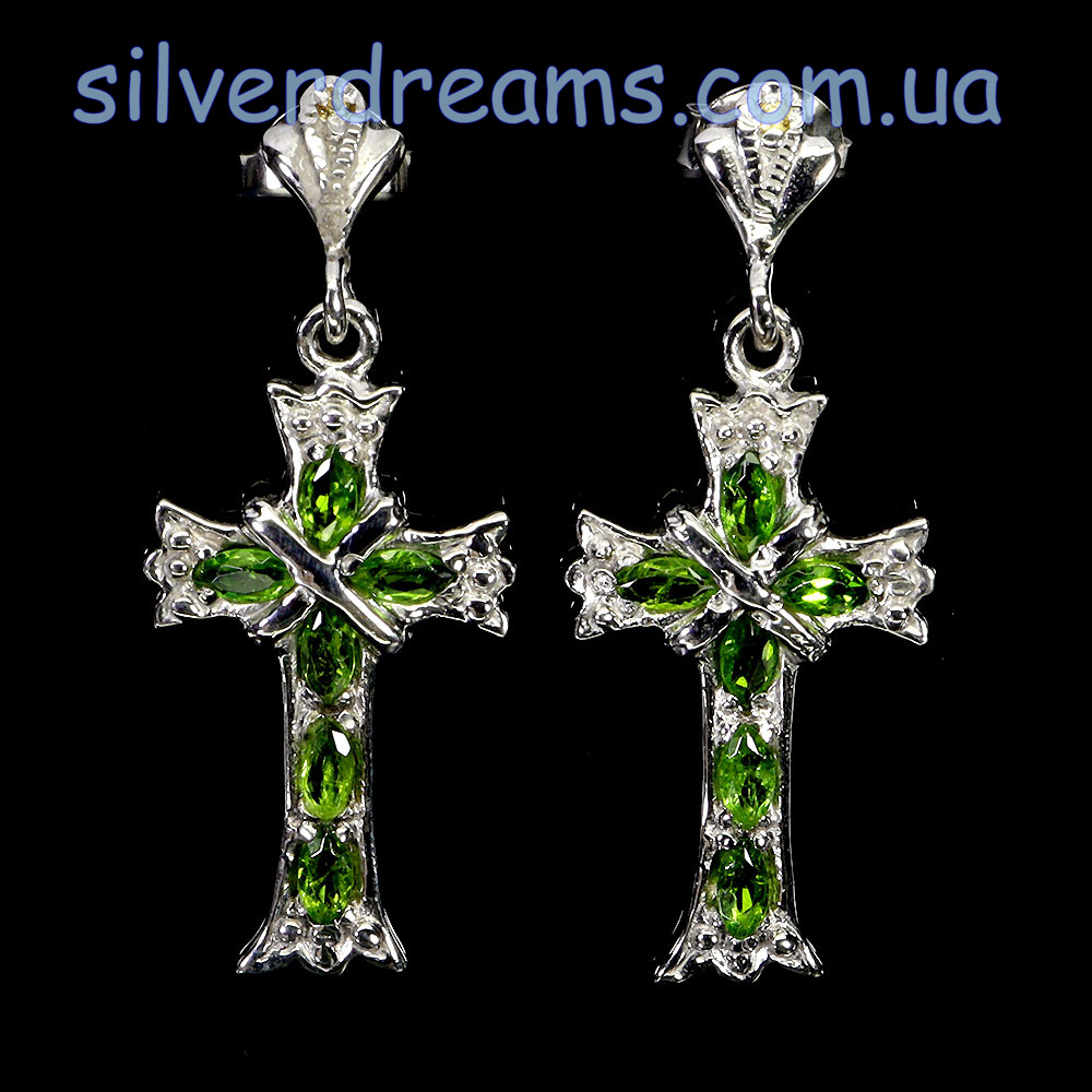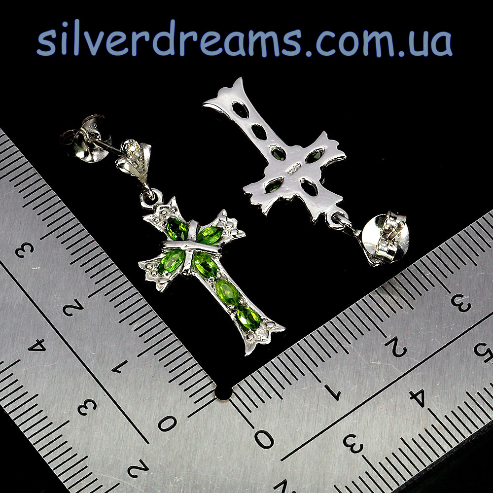 Размеры: диопсиды — 4х2 мм, сапфиры — 1 мм; серьги — 33х14 мм.