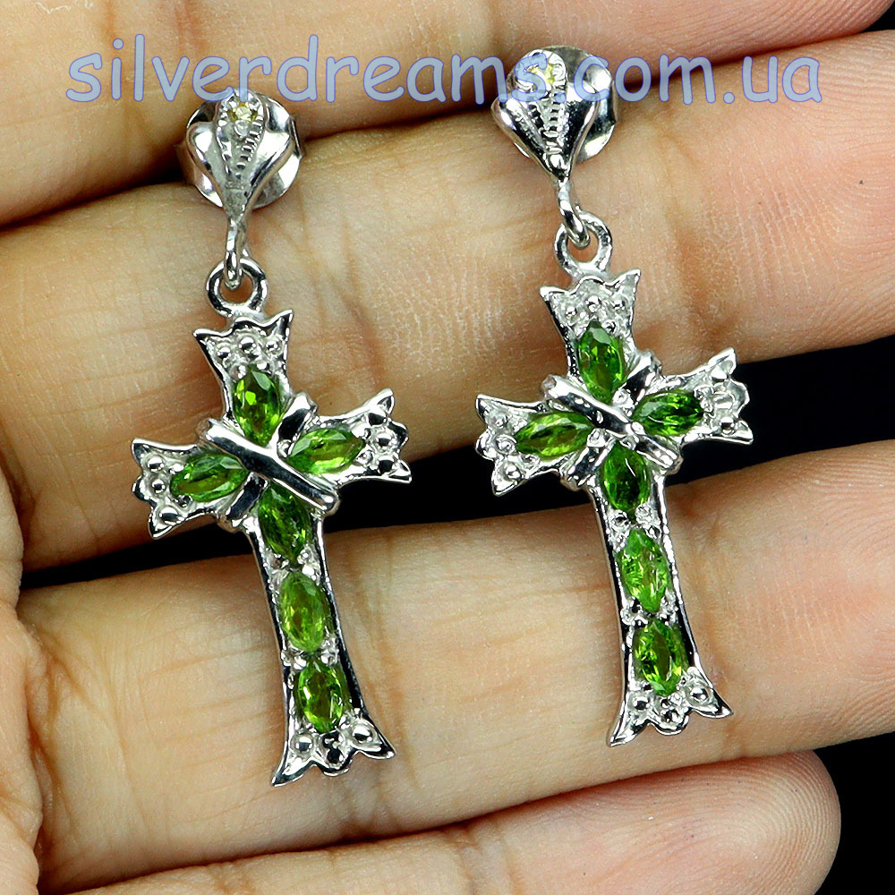 Комфортные элегантные серьги из серебра 925 пробы, покрытого белым золотом, с натуральными хромдиопсидами и шампань-сапфирами, застёжка — гвоздик.