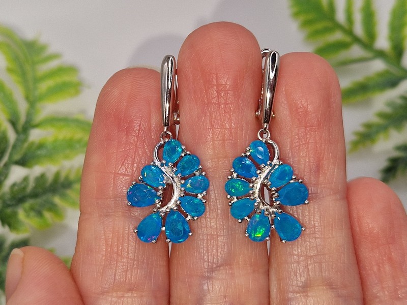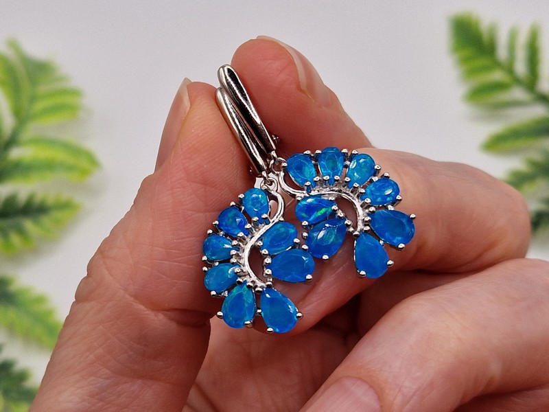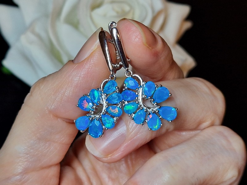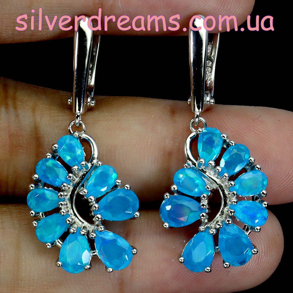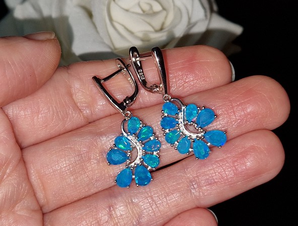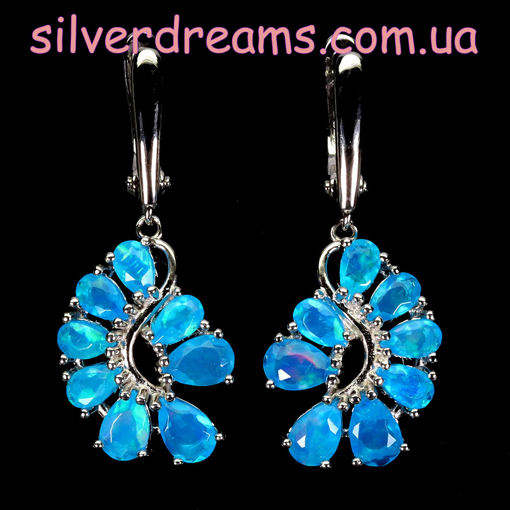 Таинственные завораживающие серьги из серебра 925 пробы, покрытого белым золотом, с натуральными голубыми опалами, застёжка — английский замок.