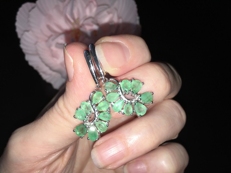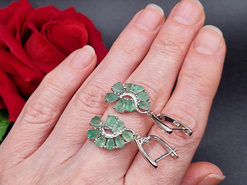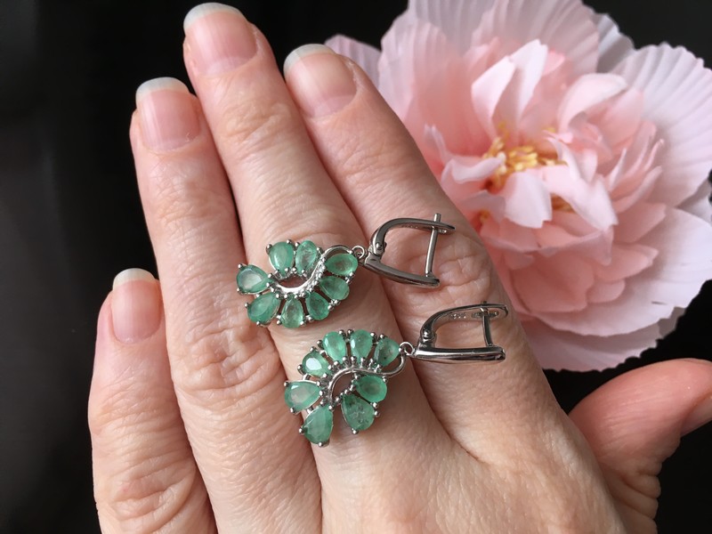 Стильные выразительные серьги из серебра 925 пробы, покрытого белым золотом, инкрустированные натуральными изумрудами, застёжка — английский замок.
