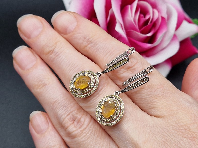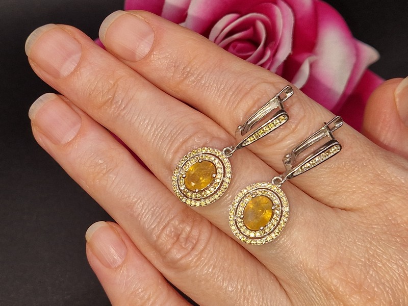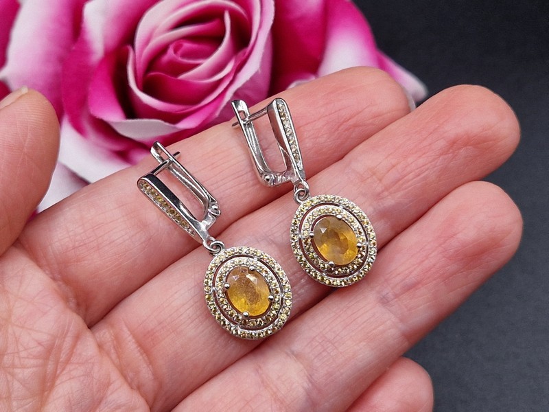 Стильные элегантные серьги из серебра 925 пробы, покрытого белым золотом, с натуральным жёлтым сапфиром и россыпью природных шампань-сапфиров, застёжка — английский замок.