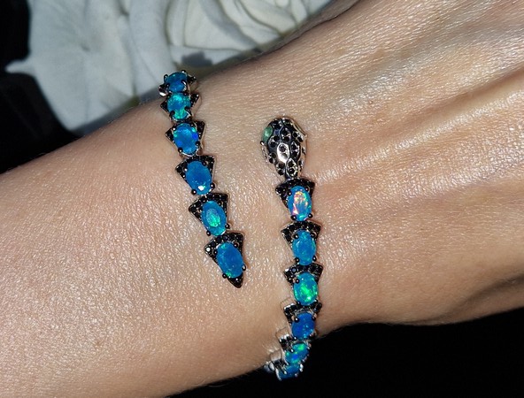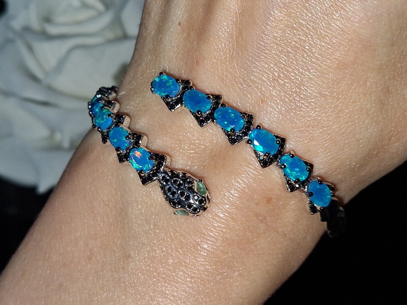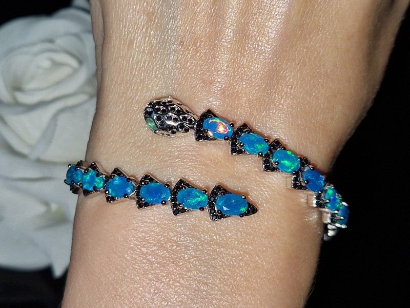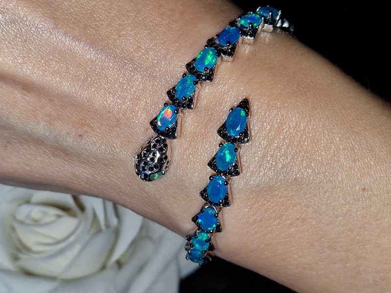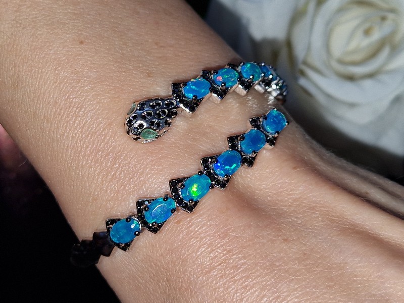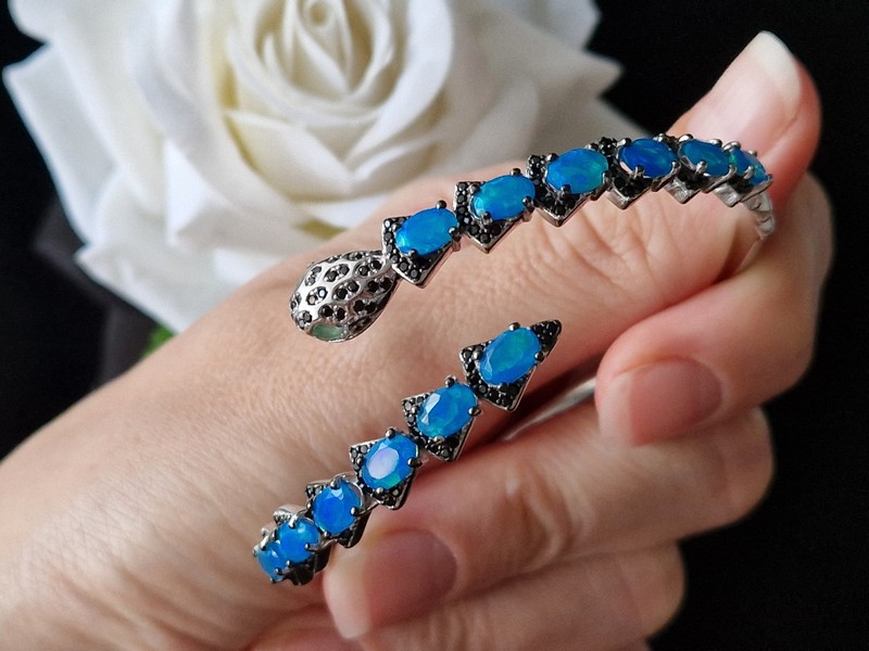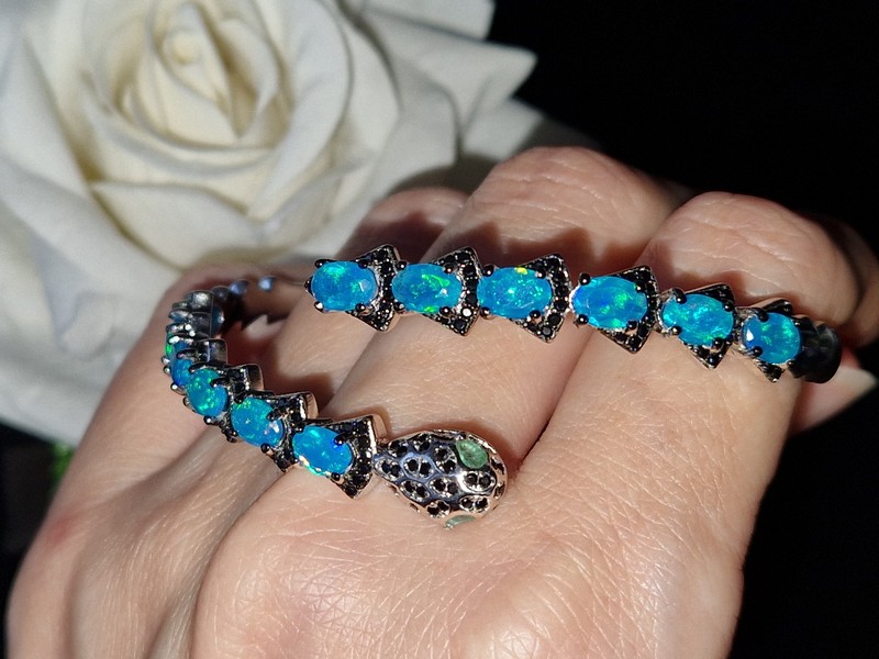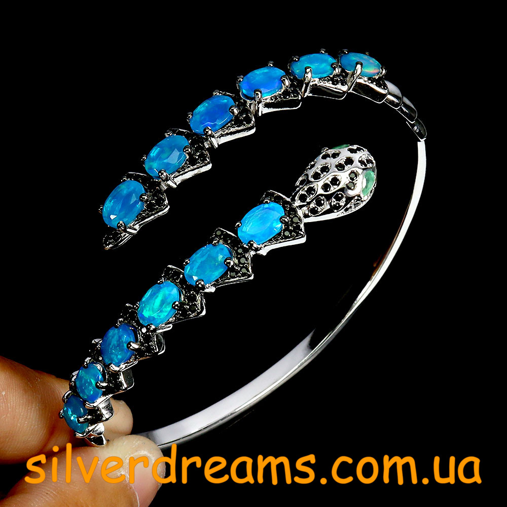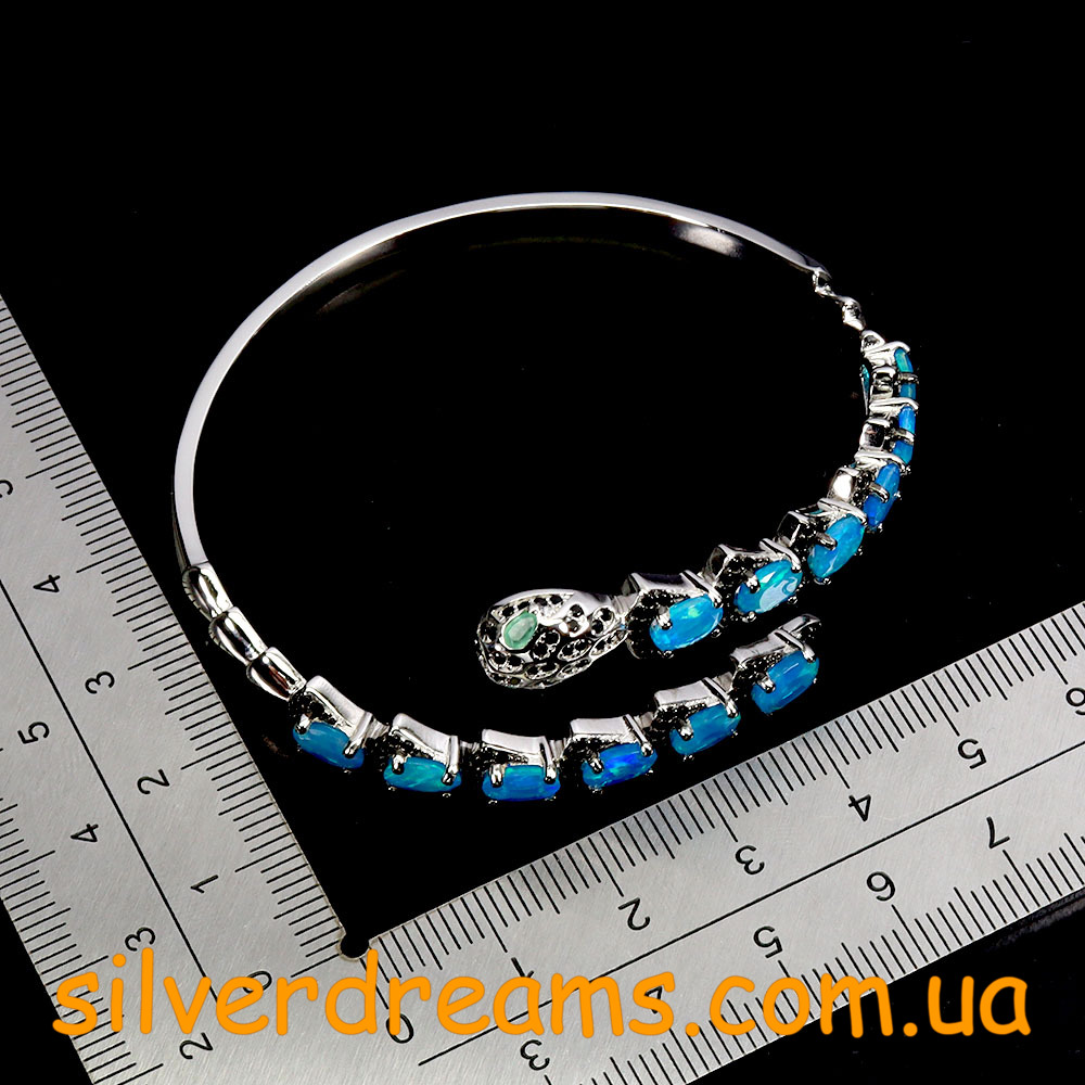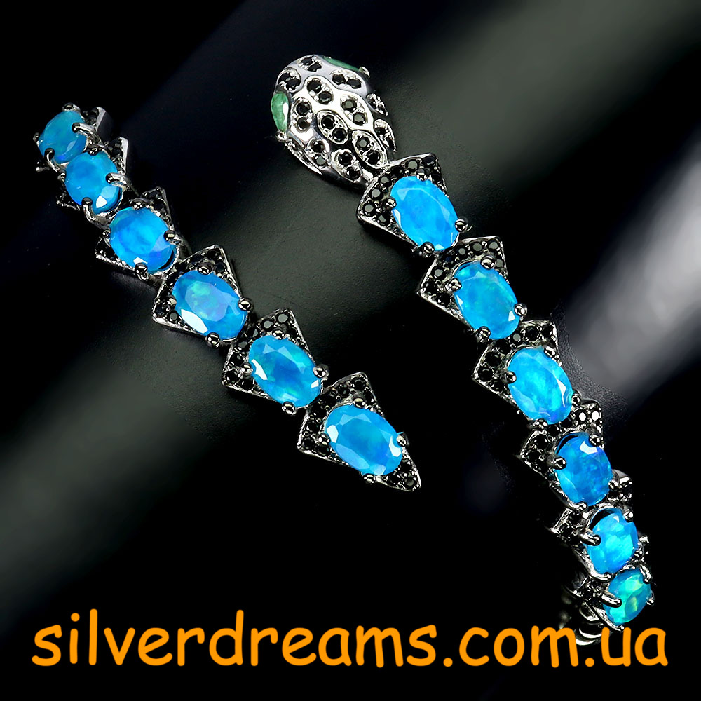 Яркий выразительный жёсткий браслет в виде змеи из серебра 925 пробы, покрытого белым золотом, с натуральными голубыми опалами в россыпи благородной чёрной шпинели, глаза змеи выполнены из природных изумрудов.