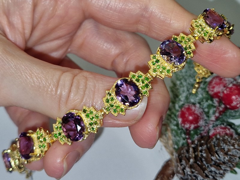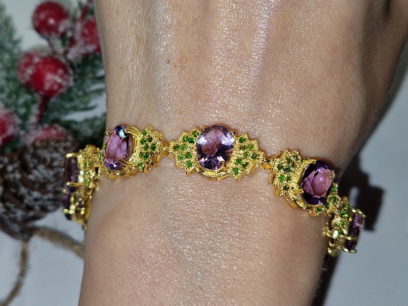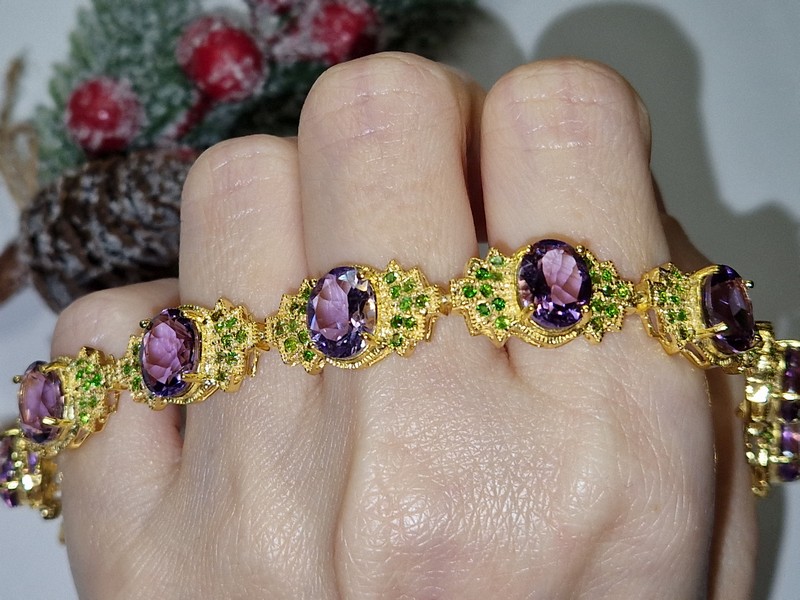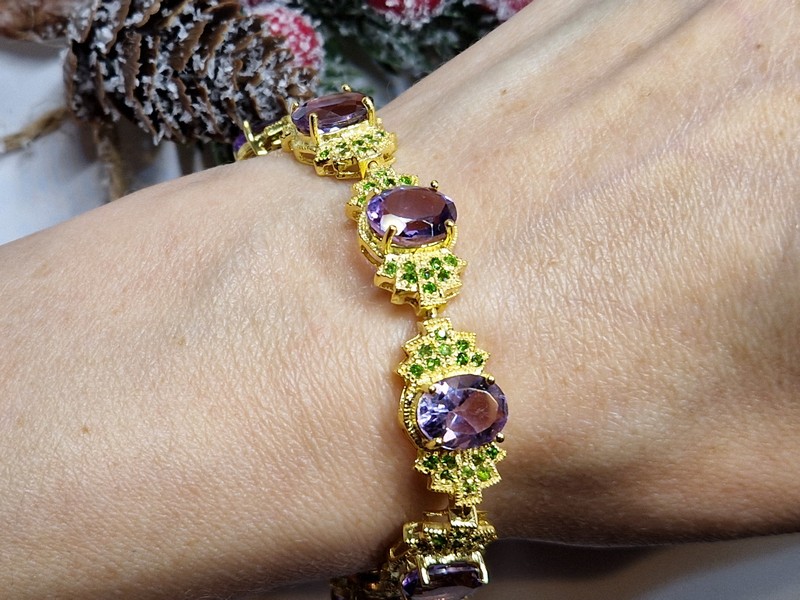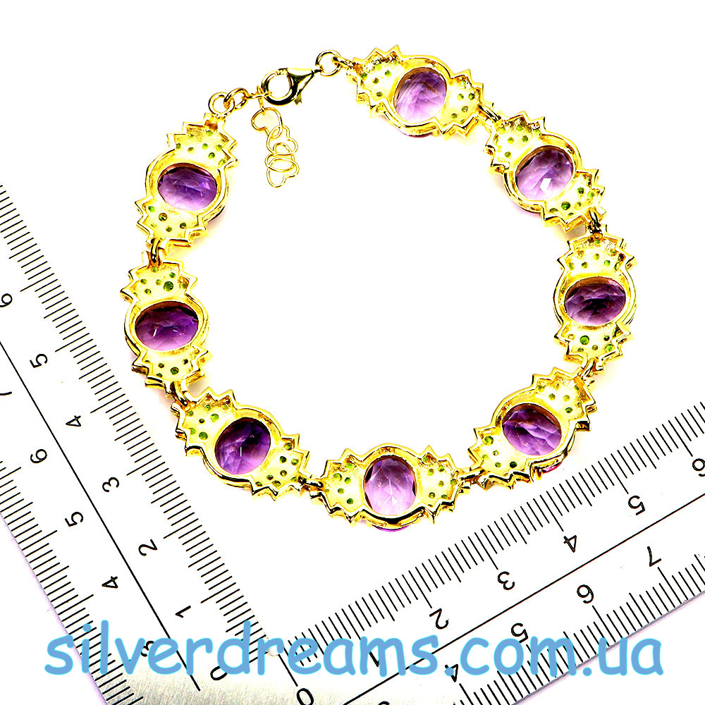 Неотразимый впечатляющий браслет из серебра 925 пробы, покрытого лимонным золотом, с крупными натуральными аметистами и россыпью природных хромдиопсидов.