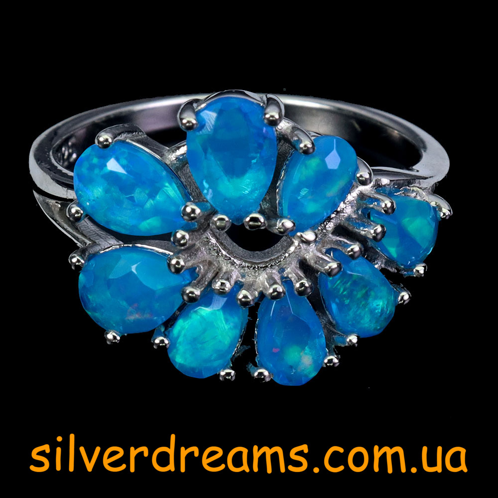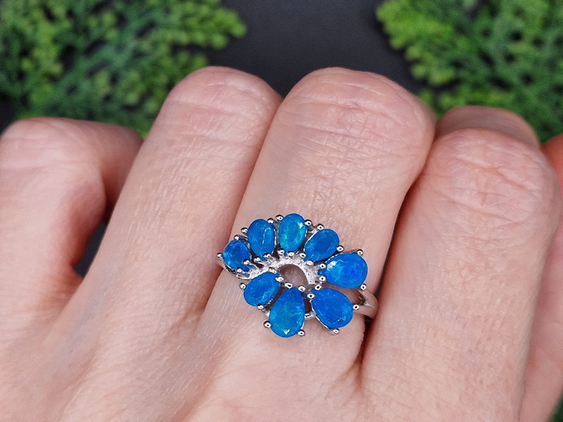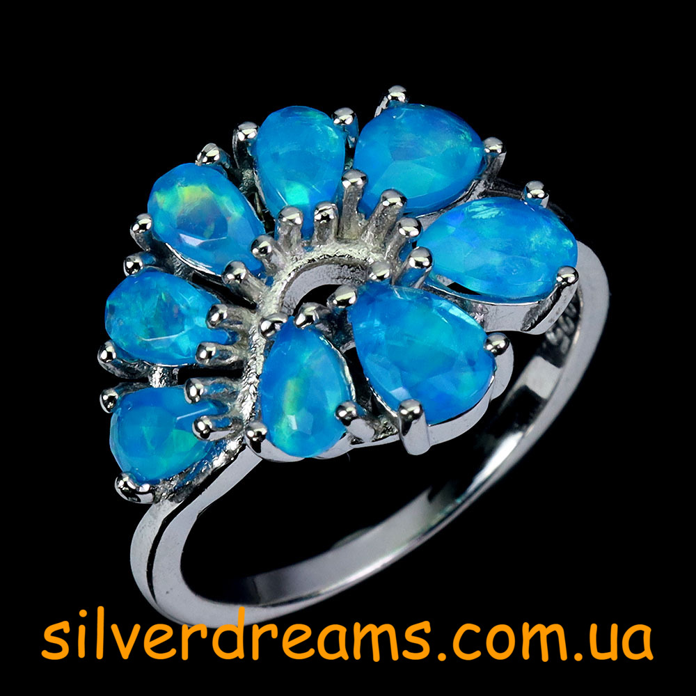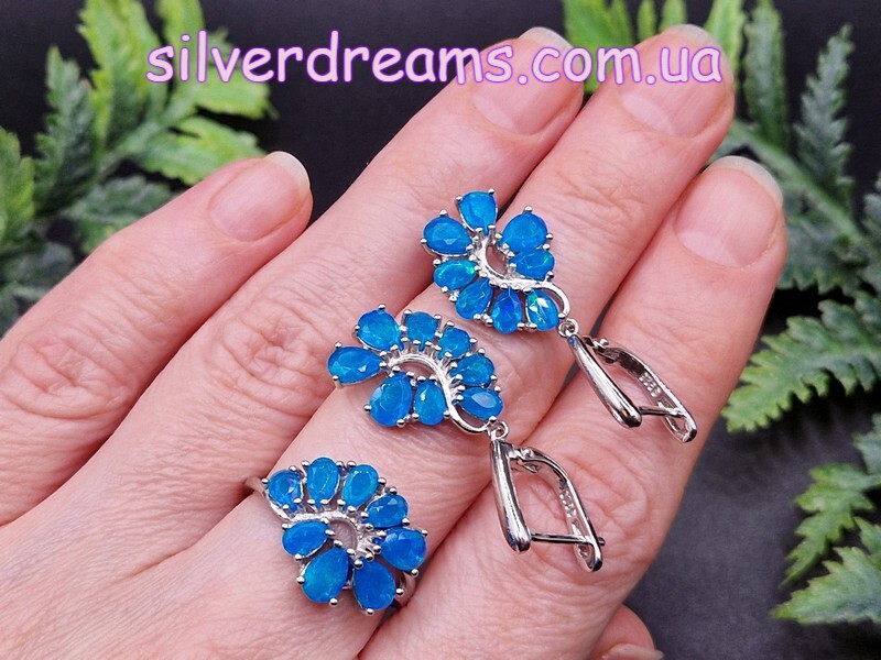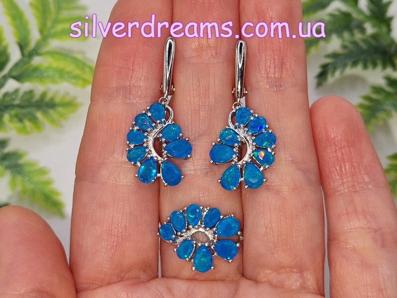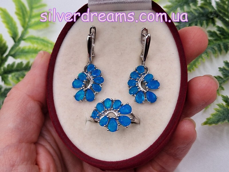 Изумительный мерцающий комплект-двойка (серьги + кольцо) из серебра 925 пробы, покрытого белым золотом, с натуральными голубыми опалами.