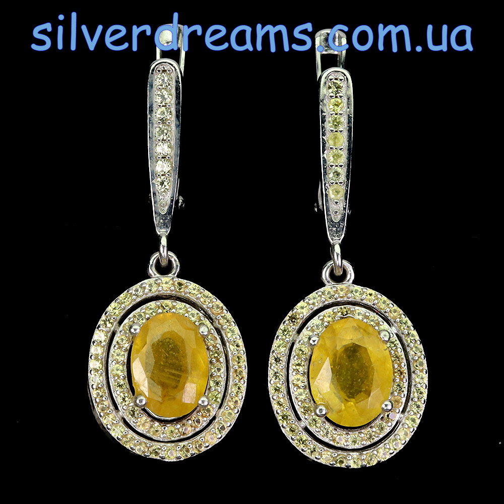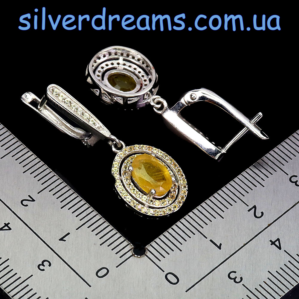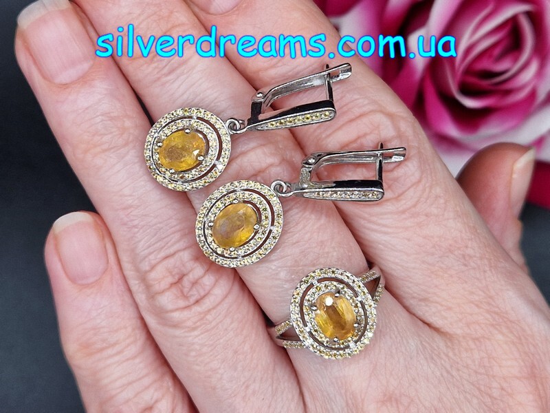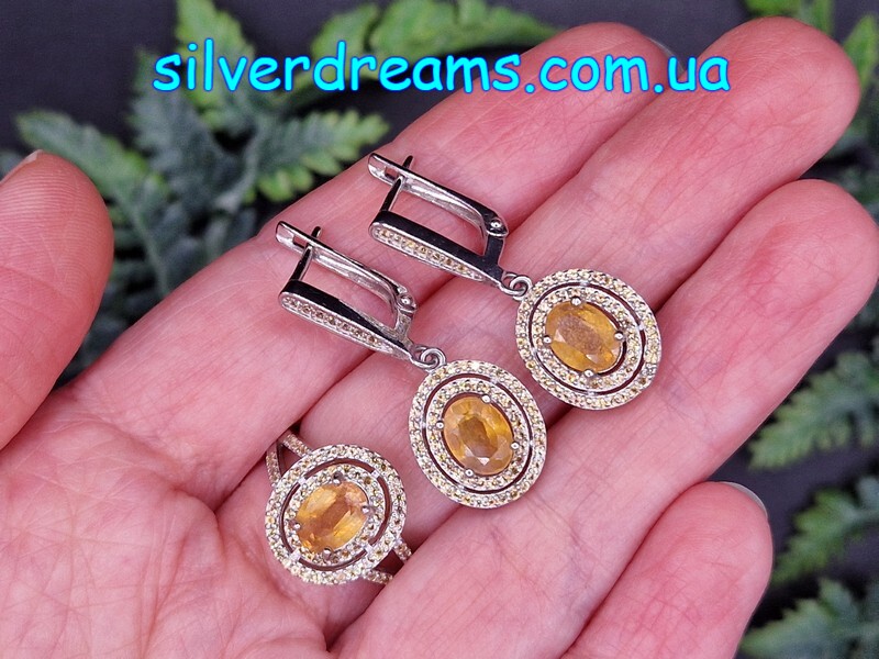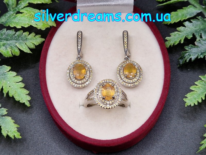 Стильный элегантный комплект-двойка (серьги + кольцо) из серебра 925 пробы, покрытого белым золотом, с натуральным жёлтым сапфиром и россыпью природных шампань-сапфиров.