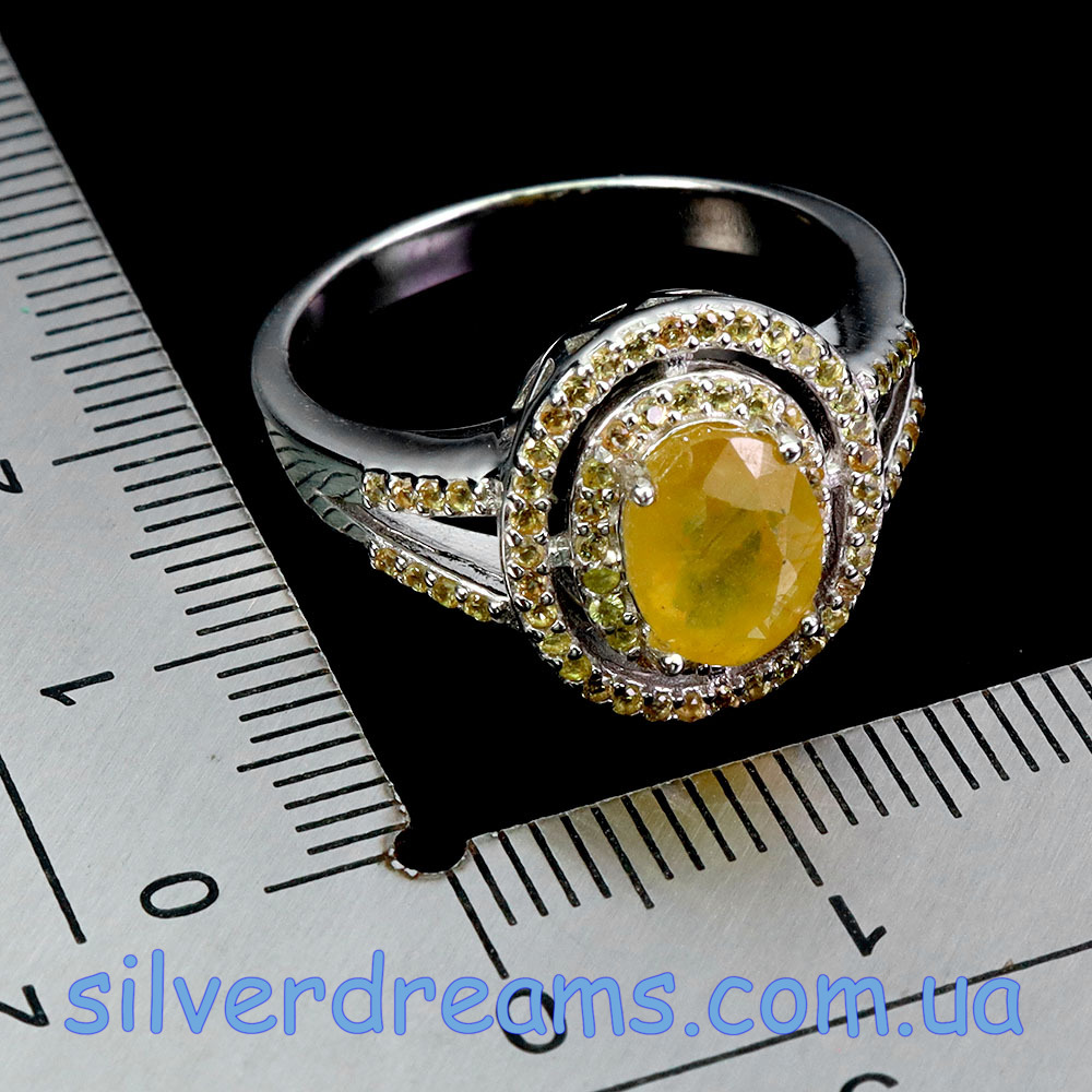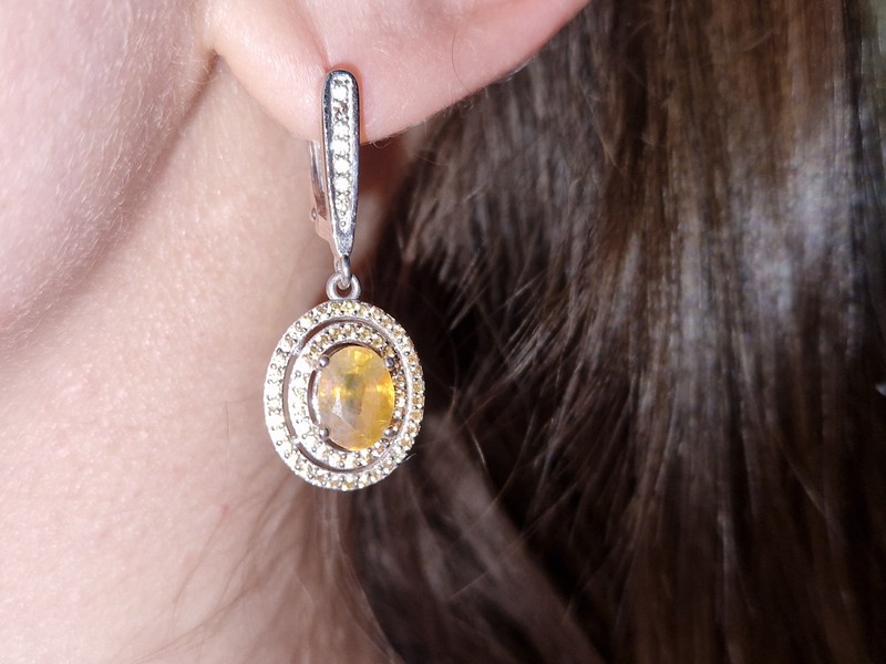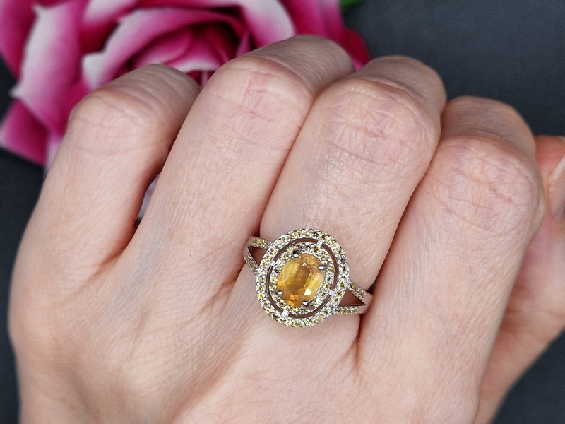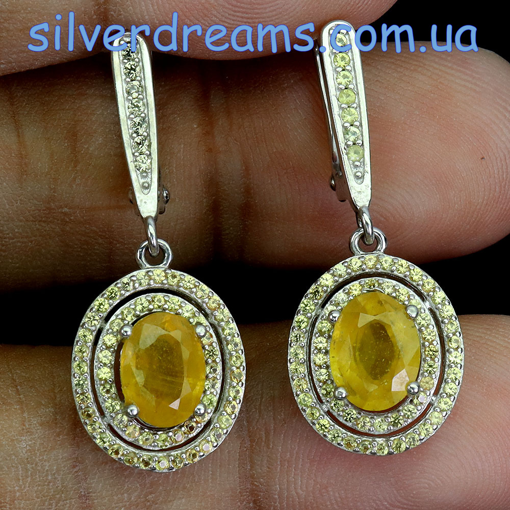 Стильный элегантный комплект-двойка (серьги + кольцо) из серебра 925 пробы, покрытого белым золотом, с натуральным жёлтым сапфиром и россыпью природных шампань-сапфиров.