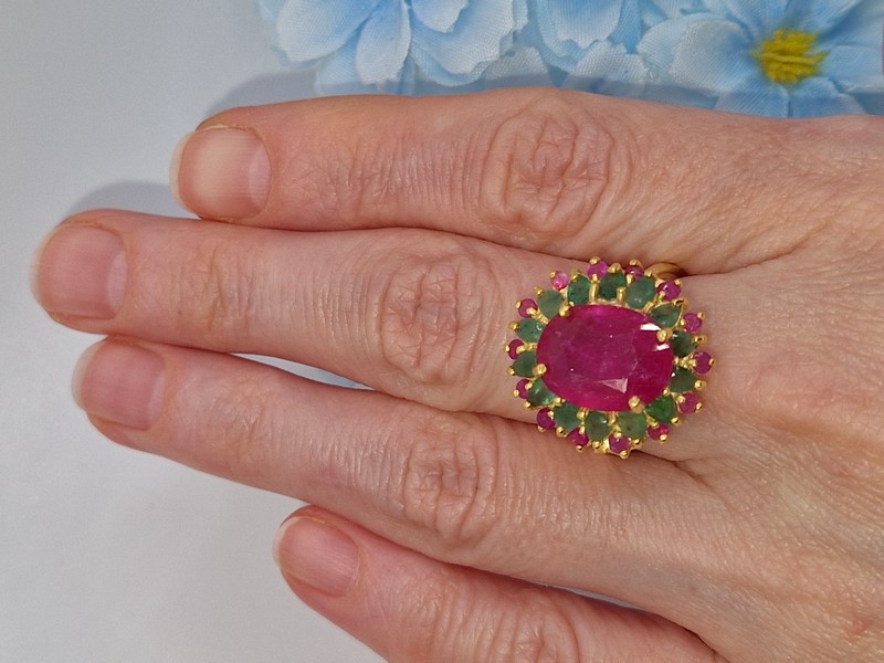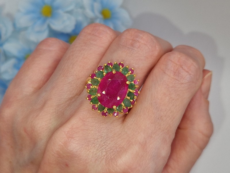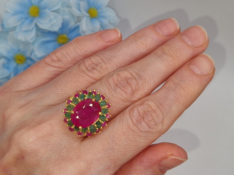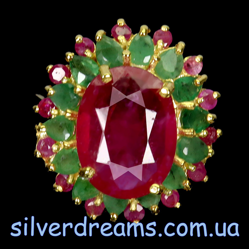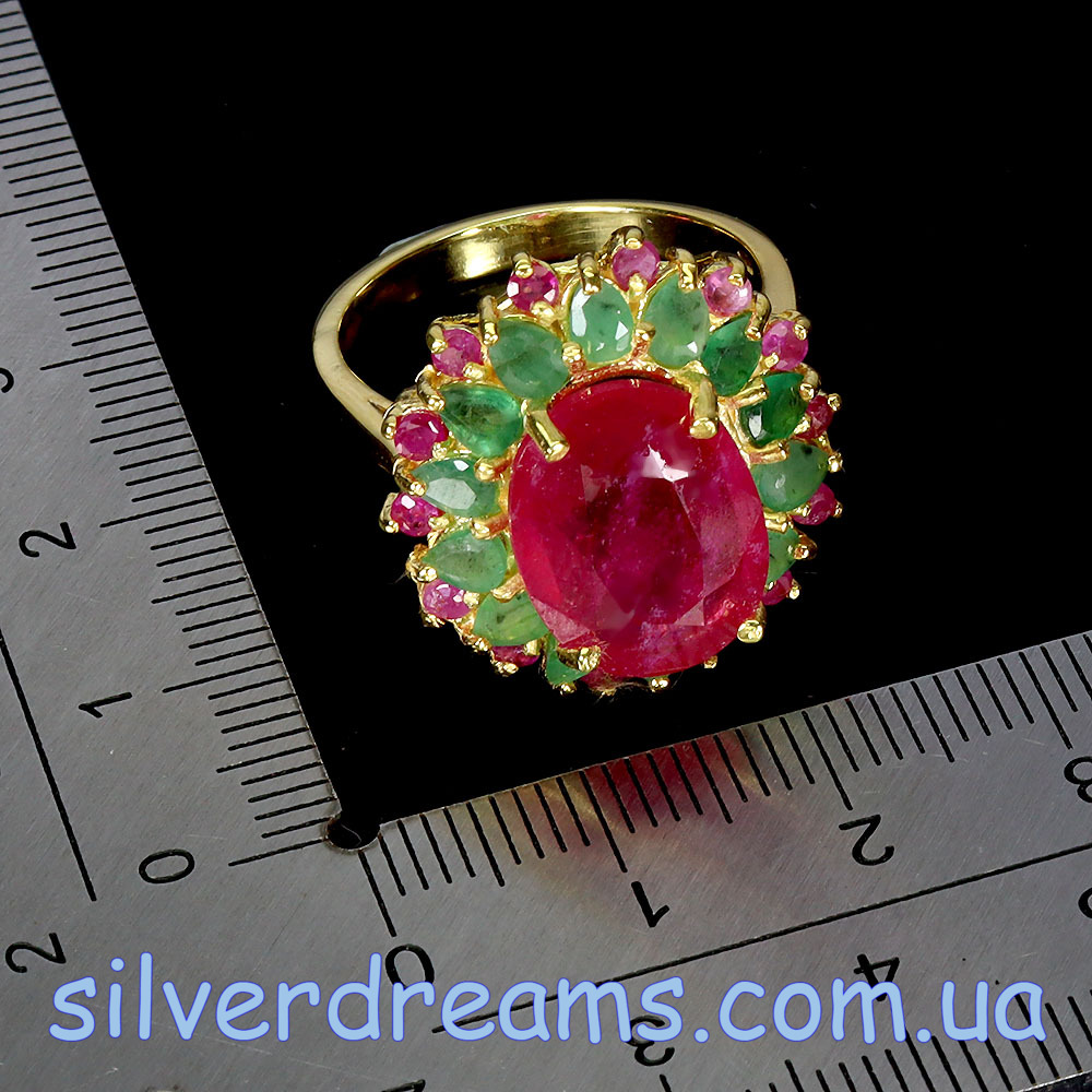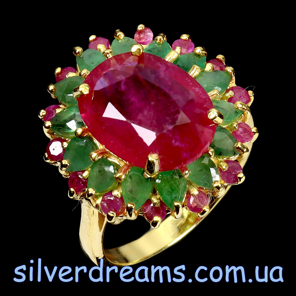 Роскошное статусное кольцо из серебра 925 пробы, покрытого лимонным золотом, с крупным натуральным рубином в обрамлении природных изумрудов и рубинов.