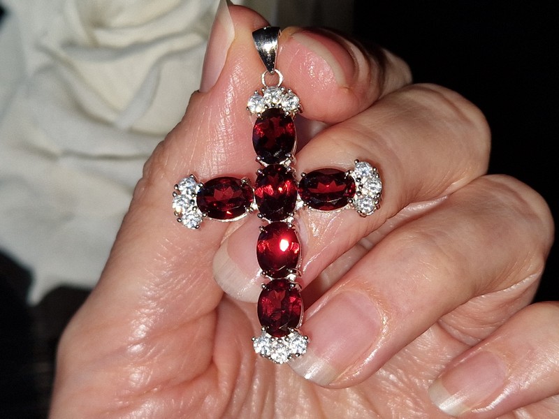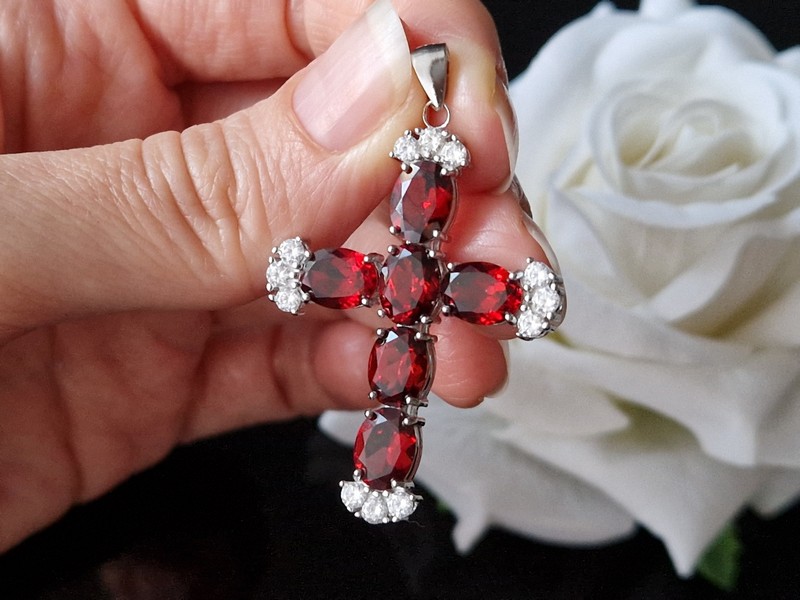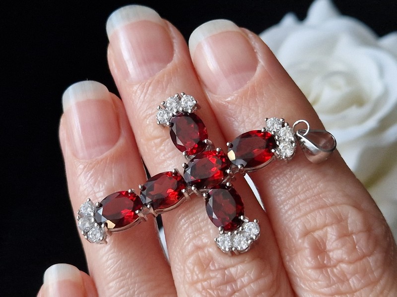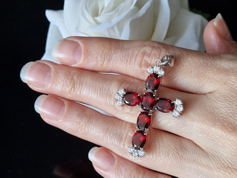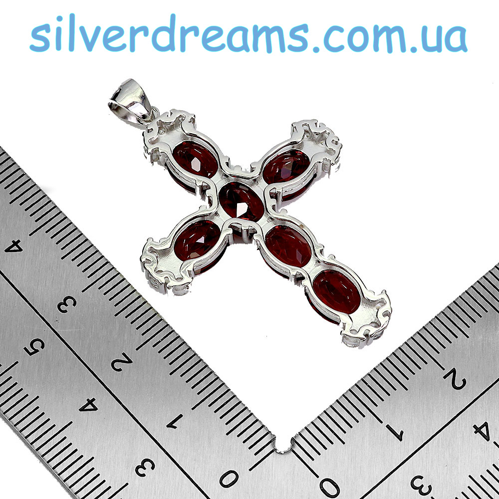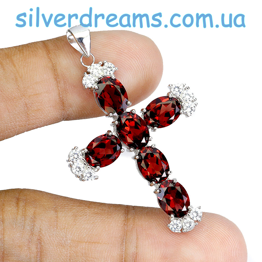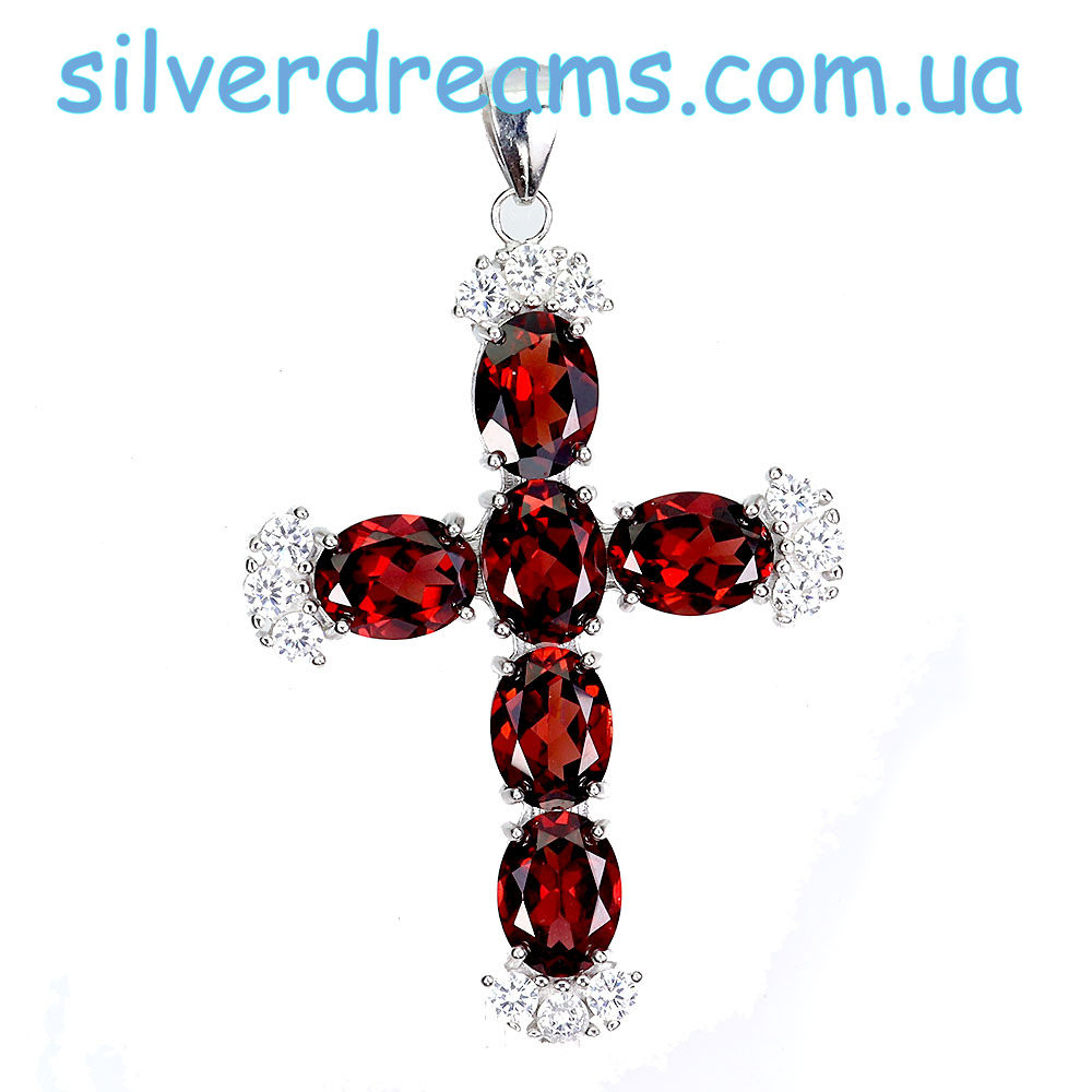 Благородный элегантный кулон в виде крестика из серебра 925 пробы, покрытого белым золотом, с натуральными красными гранатами и россыпью фианитов.